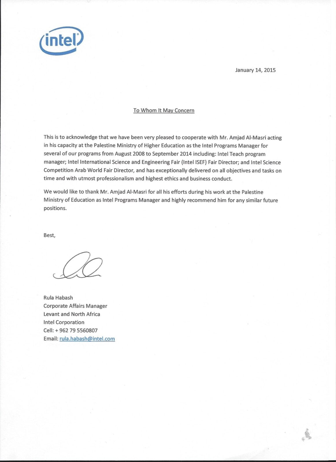 Acknowledgement Certificate for leading Intel Programs for 6 years in Palestine